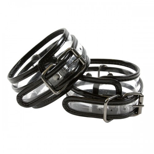 Transparent ankle cuffs. Fully adjustable nickle free hardware. Non staining body safe vinyl. Unisex design and compatible with all Bare Bondage accessories